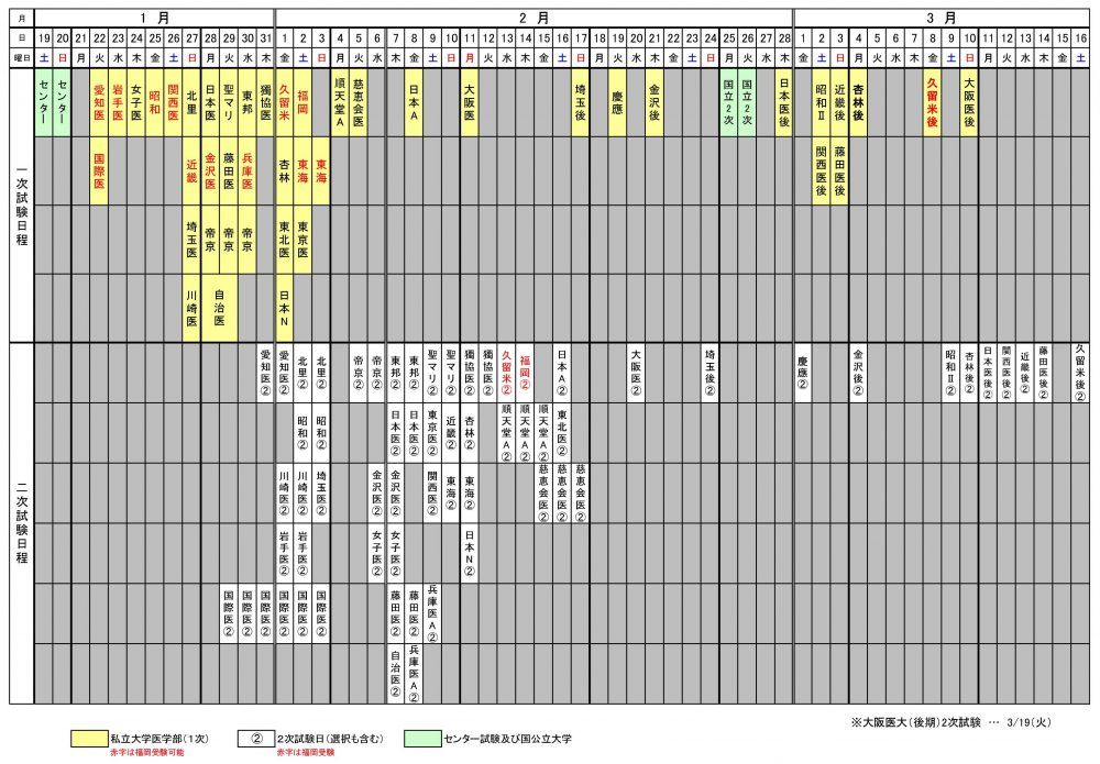 また、大阪医大は今年の入試で以前の2月10日前後から大きく試験日程を早め1月28日を1次試験に設定してありましたが、来年は2月11日(月・祝)と一昨年までの日程に戻す形になっています。