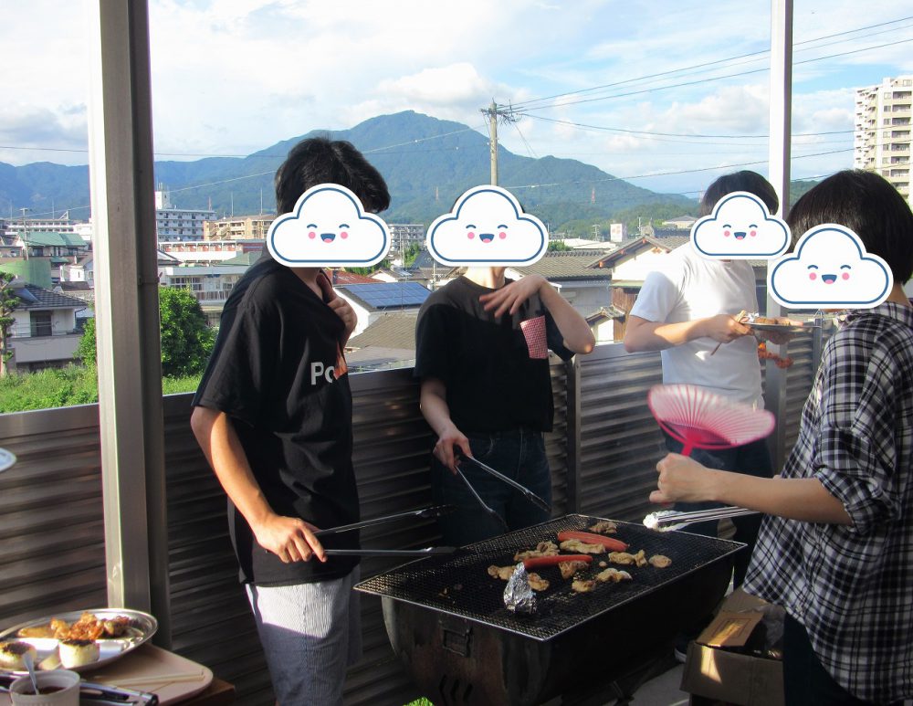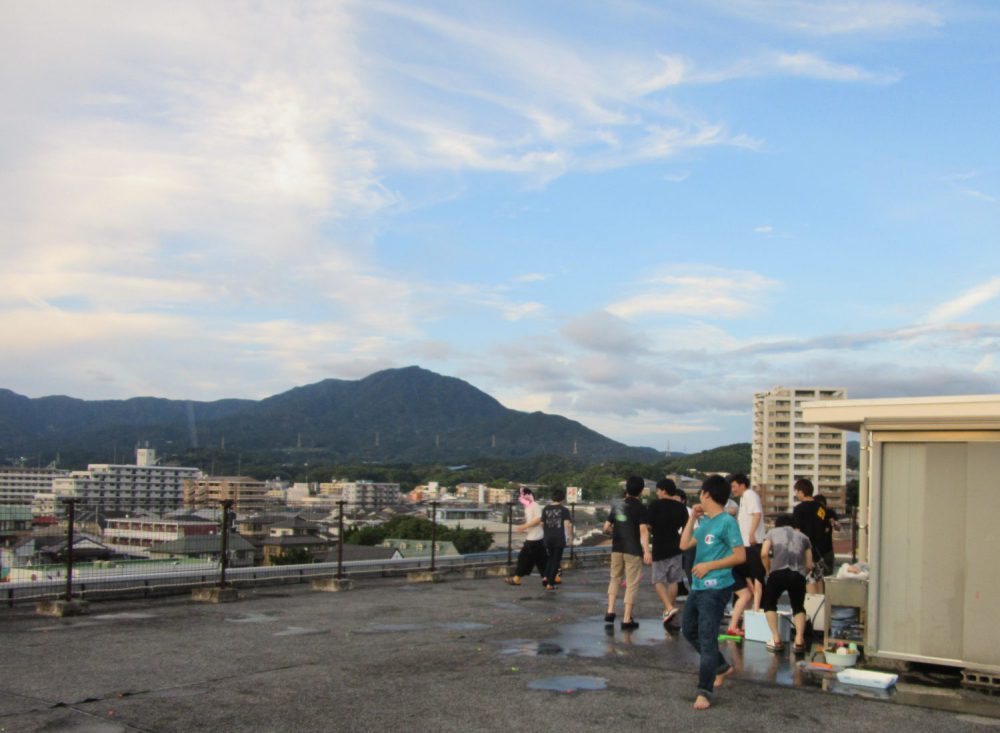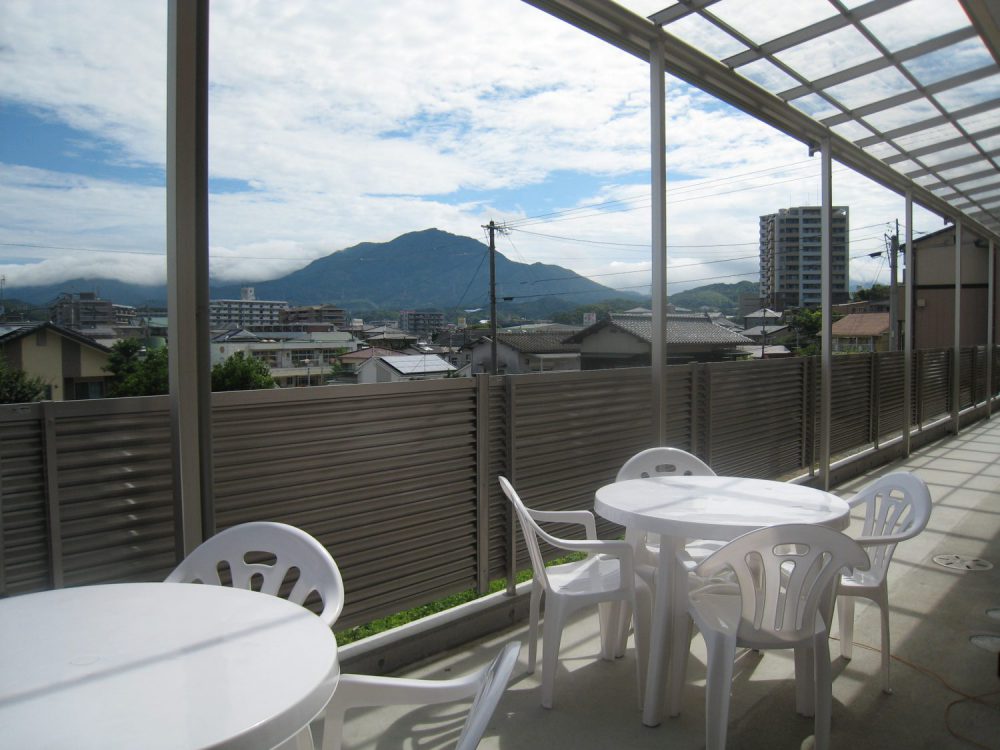 太宰府アカデミーは小高い丘の上にあるのでテラスからの景色もよく、屋根もあるため、生徒さんの憩いの場ですね^^