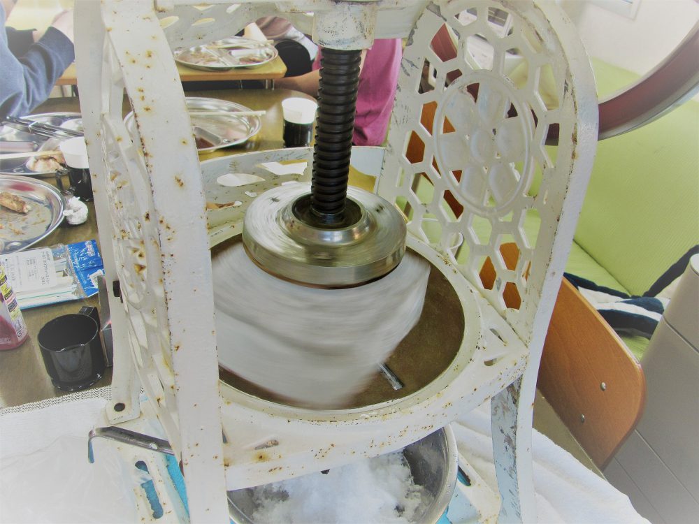 古き良き趣を感じるかき氷機(笑)を使ってみんなで作りました(*´Д`)