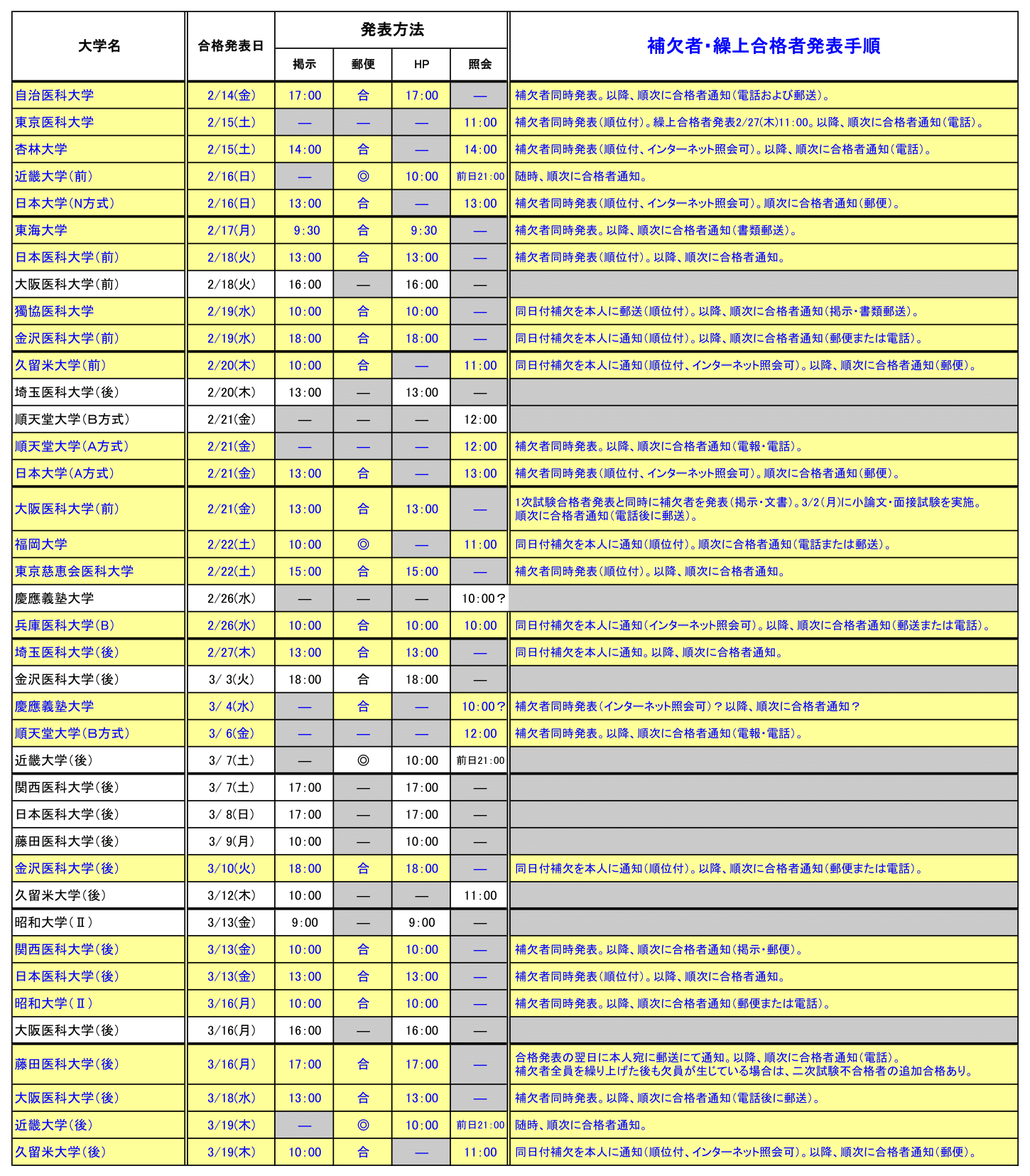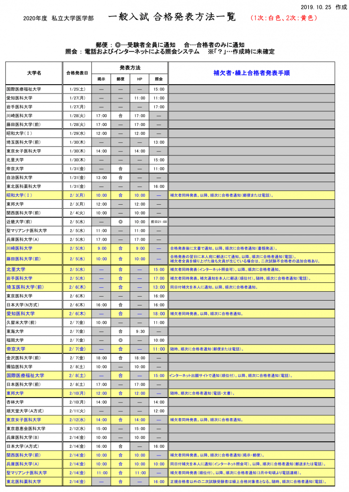 前期・後期入試 合格発表方法一覧