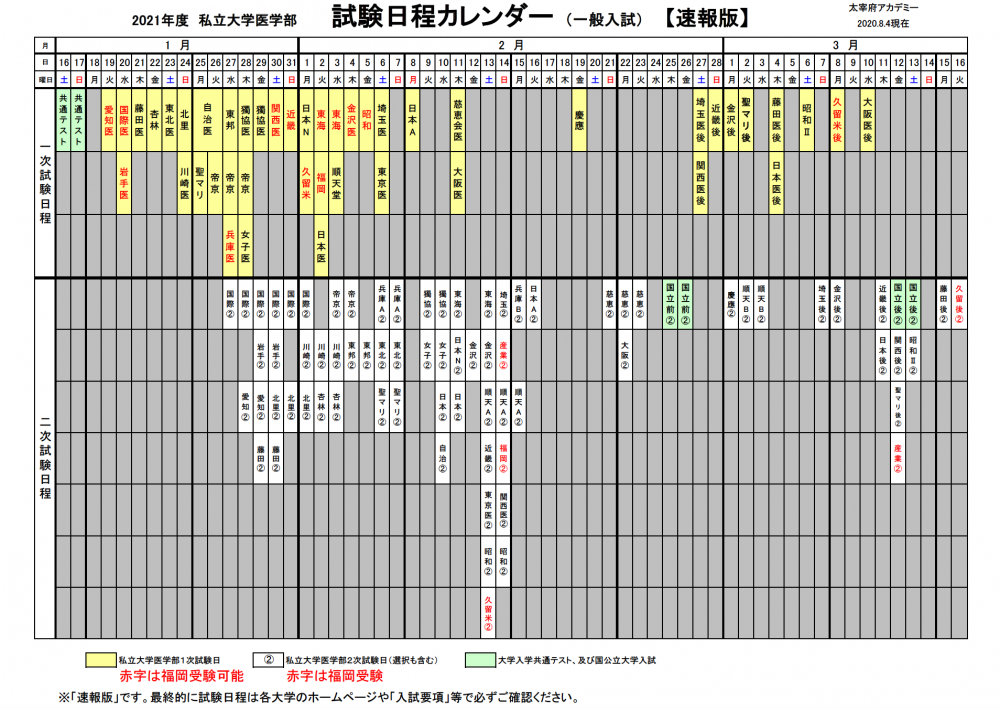 ※昨年度(2020年度)の私立医学部入試日程カレンダー記事はこちら